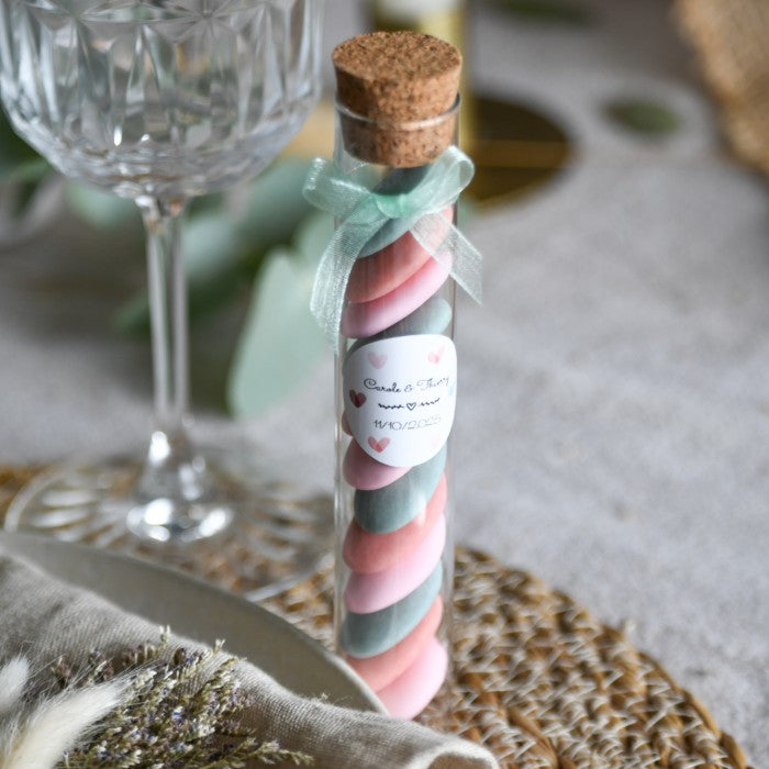 Les éprouvettes et pots en verre offrent une présentation moderne, transparente et premium. Ils mettent en valeur vos dragées et s’adaptent à tous les thèmes : chic, bohème, romantique ou minimaliste.