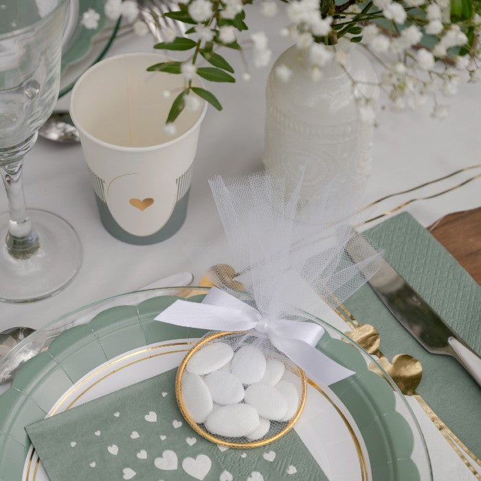 Sublimez vos cadeaux invités avec notre anneau à dragées spécial mariage, un accessoire chic et intemporel qui apporte une touche de raffinement à votre décoration. Composé d’un anneau doré, d’un nœud blanc en satin et d’un tulle blanc délicat, il met parfaitement en valeur vos dragées, chocolats ou petites douceurs.