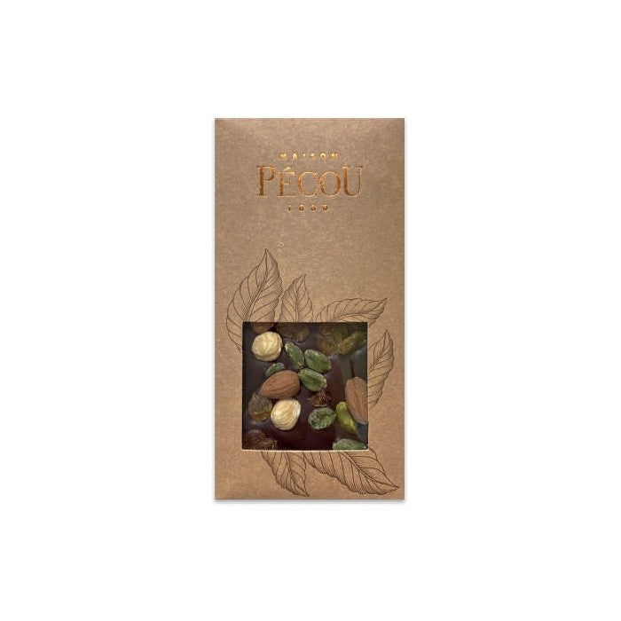 La tablette La Charmeuse est une création gourmande et généreuse, élaborée à partir d’un chocolat noir intense sublimé par un assortiment de fruits secs croquants : amande, noisette, pistache et raisin sec.